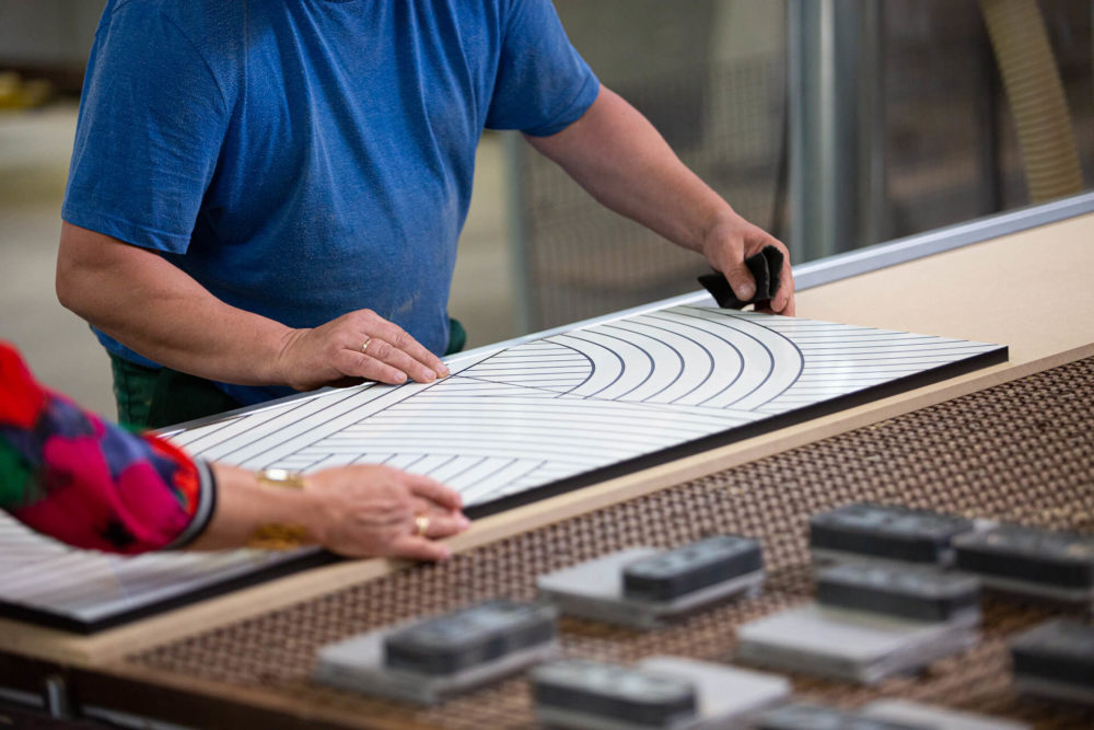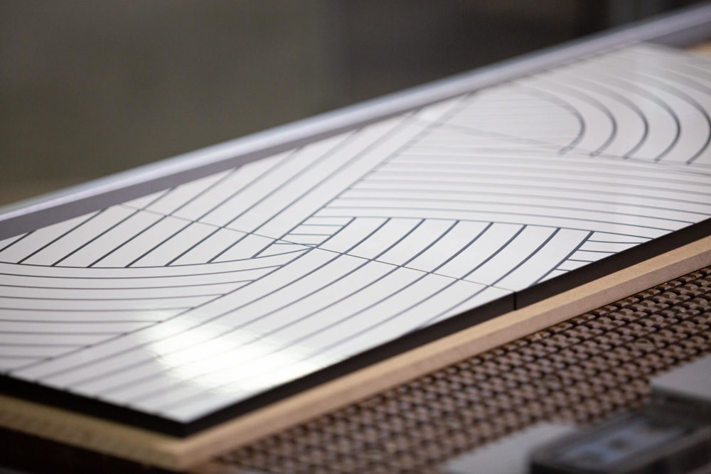 MICRO MILLING™ technology consists in the precise surface treatment of a COMPLETE SKIN board. However, in order to achieve the intended effect, its front is covered with a two-colour film with a thickness of 200-300 μm. The external layer is milled according to the design. For processing we use special copying units with real-time electronic thickness measurement and diamond mills. Machining with MICRO MILLINNG™ technology is carried out in the depth range of 50 μm-100 μm. We use specialized Alphacam software, which allows us to import and convert very complex graphic designs made by our designers or received from the customer into machine codes.